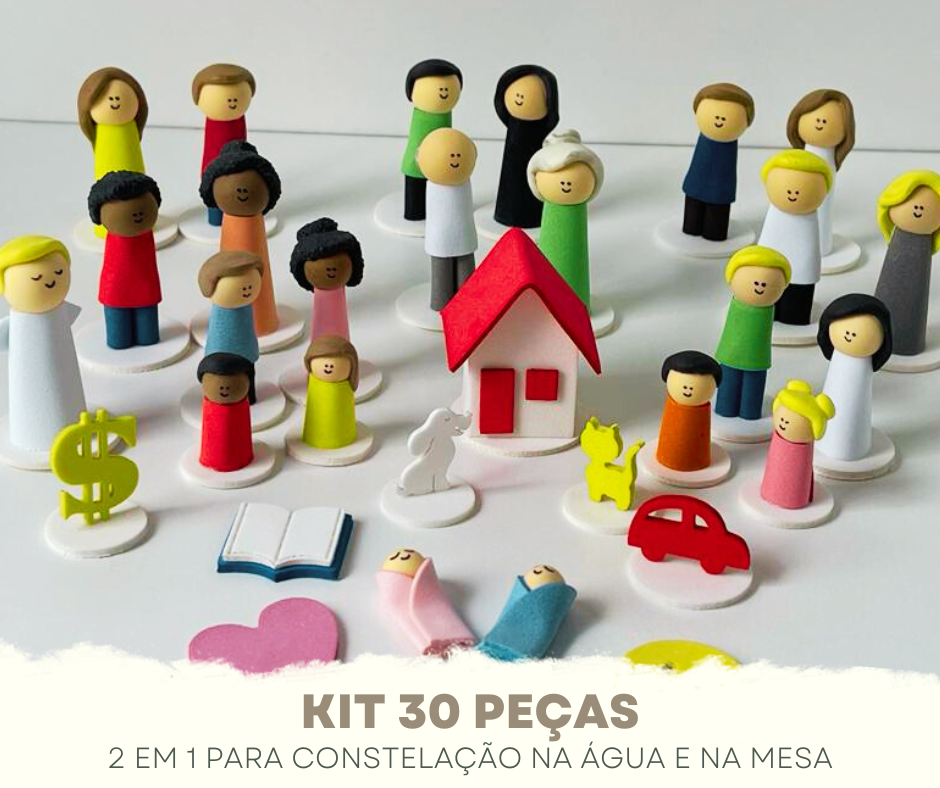 Kit de Bonecos Fluviais com 30 peças para Constelação Familiar na mesa e na água.